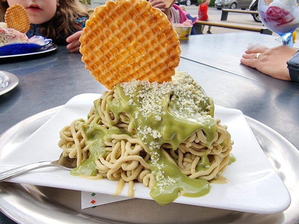 Spaghetti Eis mit Pistazien Eis und Pistaziensoße. Diese Eisdiele vor meiner Wohnung ist noch mein Untergang…..