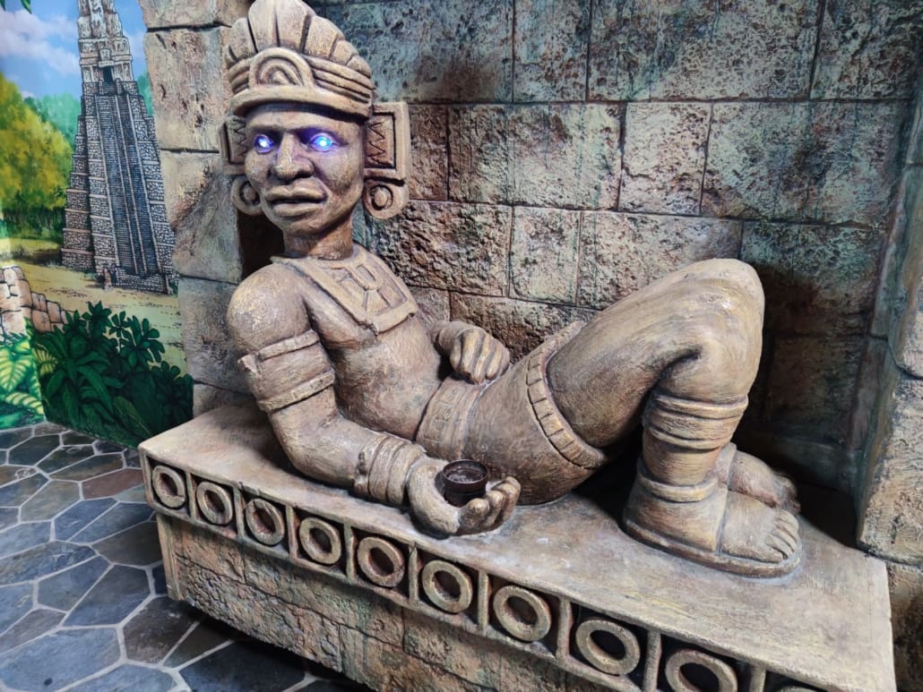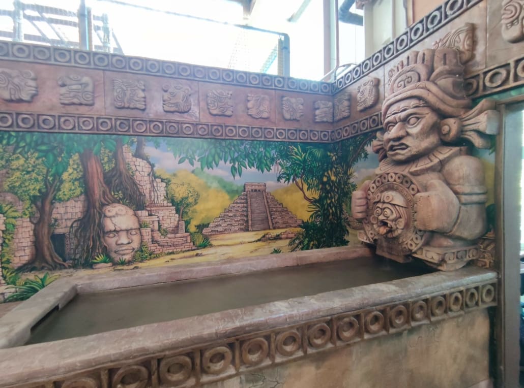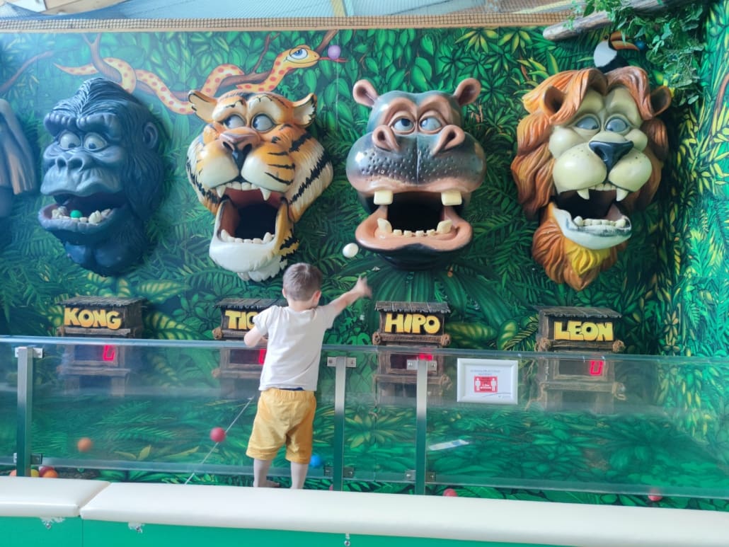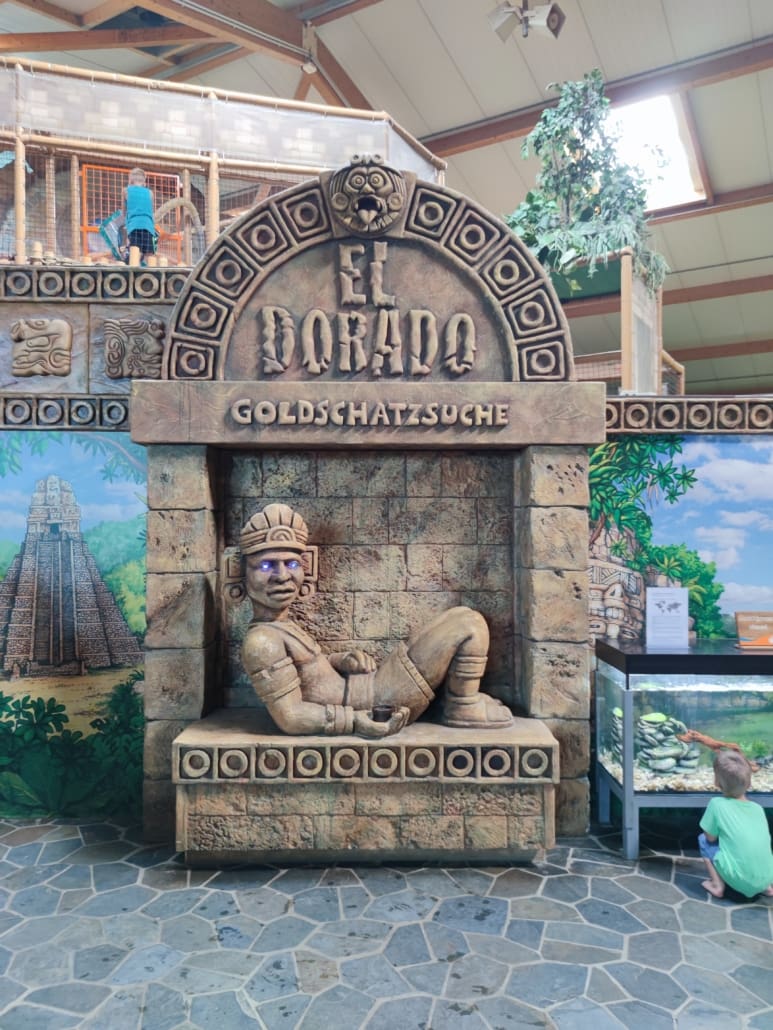Erst muss man durch einen Maya Tempel, landet dann in einem riesigen Indoorspielplatz mit Bällebad, Kletterpark, Laser Game, Goldsieben, Rutschen, Kletterwand und vielem mehr.