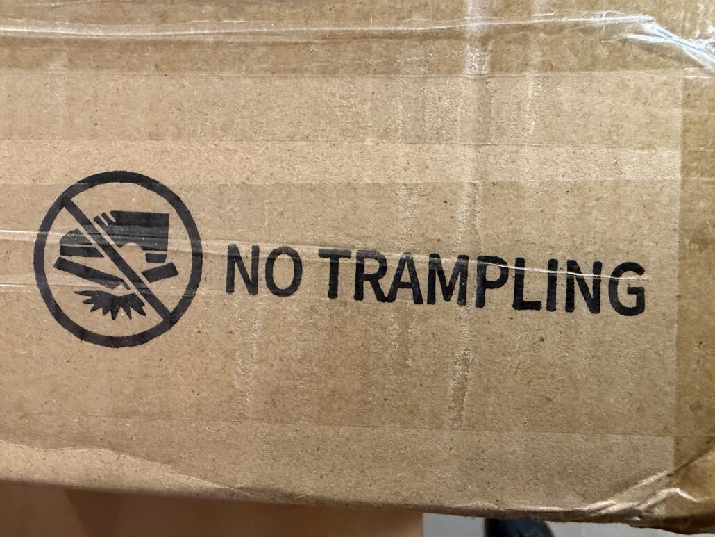 Ich musste mir eine englisch schwache, unbeholfene Person vorstellen, die versucht, jemandem zu erklären, dass er nicht auf den Karton herumtrampeln soll. Ähnlich dem „Yellow from the Egg“.