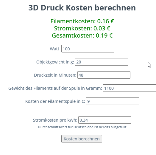 Der Stromverbrauch am Anfang ist beim Aufheizen 150 Watt, welcher später auf 80 Watt herunterfällt. Ich nehme immer 100 Watt als Durchschnitt. Dann noch die Kosten für Strom und Filament.