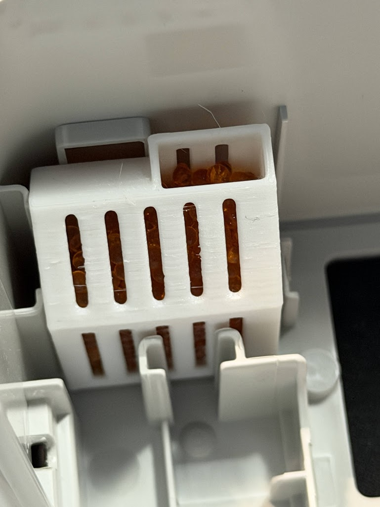 Man kann danach auch das Filament darin lagern. Dafür ist auf der Rückseite ein Magnetdeckel dabei, bei dem man ein Silica-Päckchen legt und dann zumacht.
