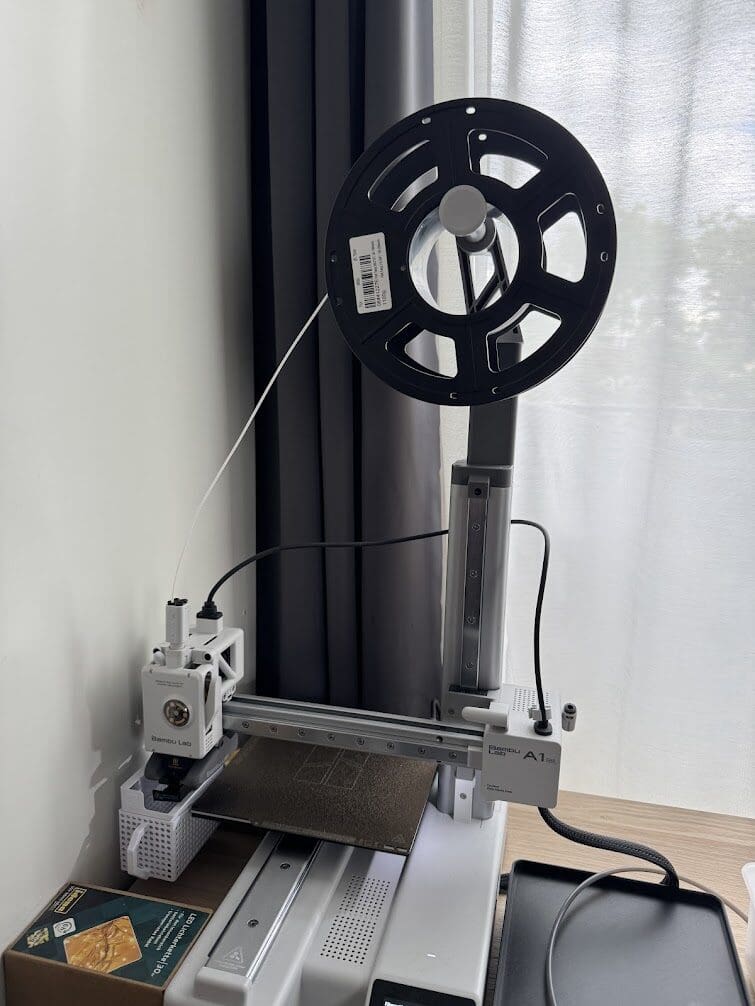 Nach dem Urlaub hatte ich erst mal bei meinem A1 Mini die Spule nach oben gebaut, weil es mir auf dem Keks ging, immer das Filament hinten einzufädeln .