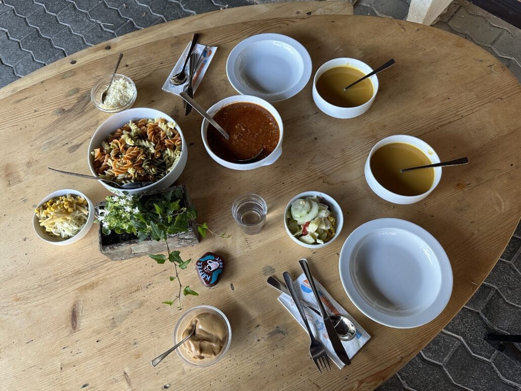 Unser Tisch war in einem großen Raum, wo auch zwei Jugendgruppen drin waren. Ich fragte, ob wir draußen vor dem Haus Essen könnten, da wäre es ruhiger und kühler.