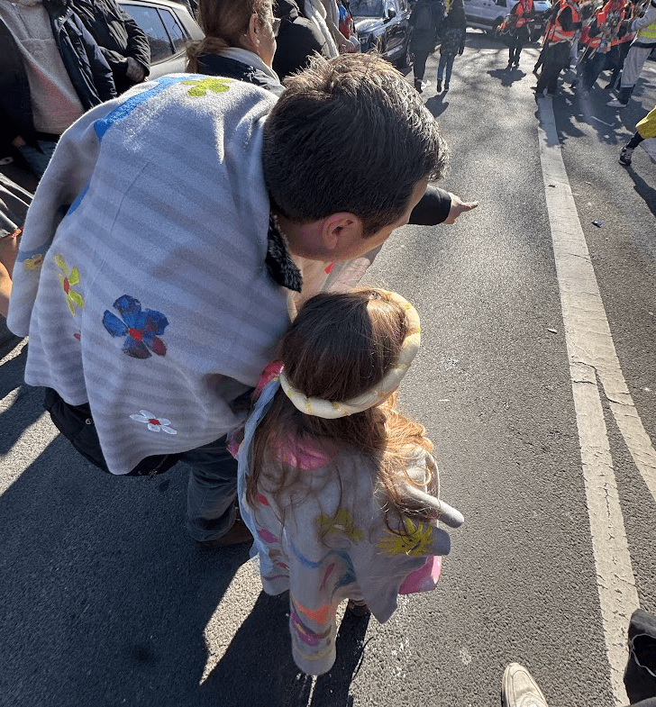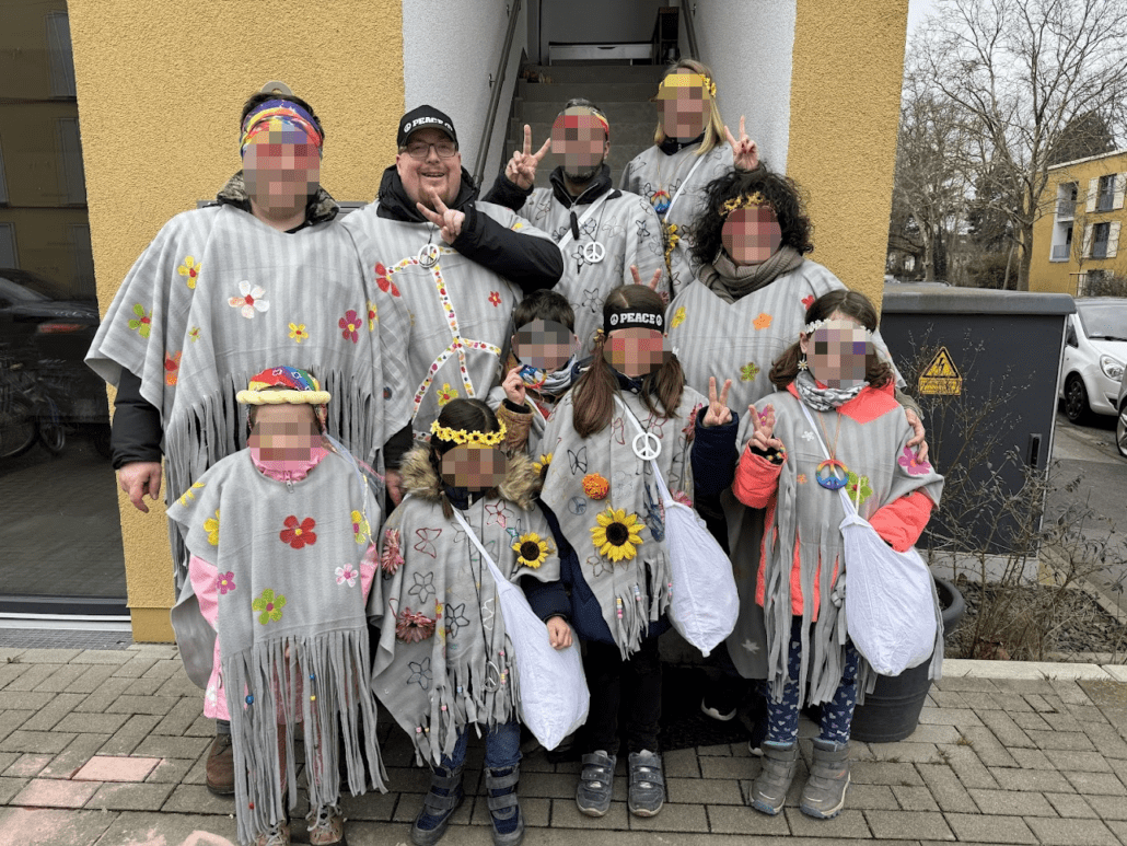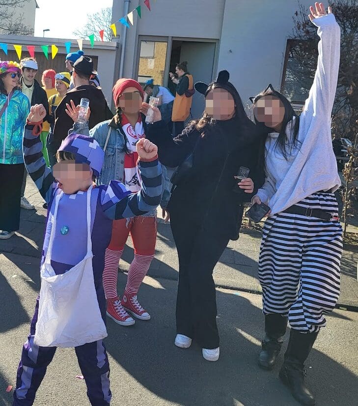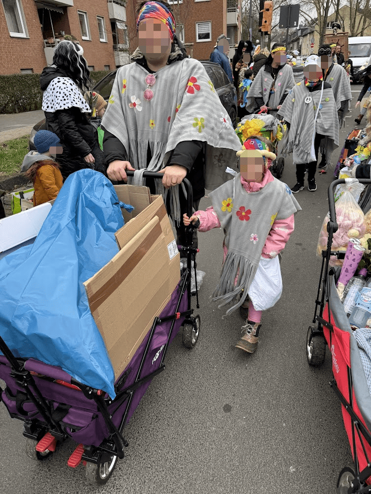 Samstag gingen wir auf dem Ossendorfer Veedelszug mit. Ich wollte eigentlich nicht mit, weil mir das nicht liegt, aber ich sprang für die Frau von meinem Freund ein, die krank zu Hause blieb. Der Bruder meiner Frau war auch in Köln zu Besuch und ging mit uns mit.