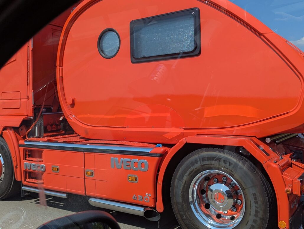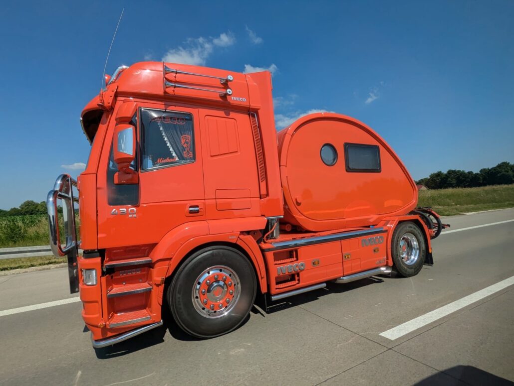 Aber eigentlich kompletter Wahnsinn. Die ehemalige Zugmaschine hat irrwitzig viel Leistung und Zuladung, da könnte man wenigstens das Wohnklo auf die Breite und Höhe der Kabine vergrößern.