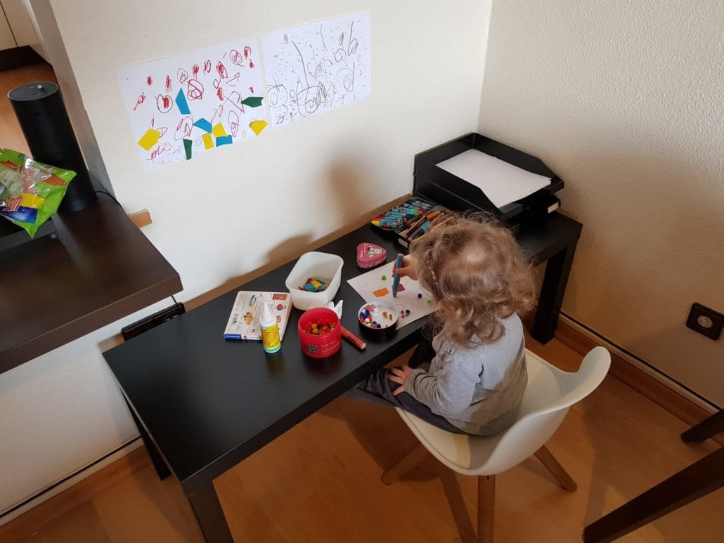 Unsere Tochter hat jetzt eine Bastelecke. Und daran hat sie sehr viel Spaß. Für ihre nicht mal 2 Jahre kann sie schon viel selber machen.