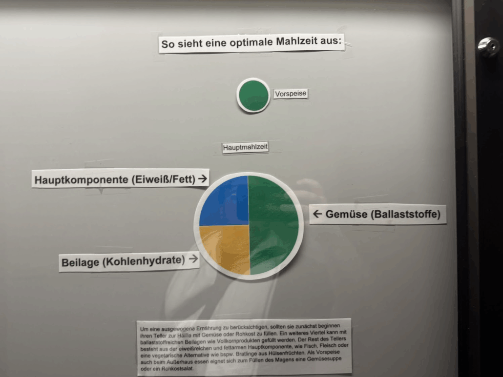 Tipp war: 1x Beilage (fettarm und nicht über ~ 200 g), 1 Kelle Kartoffeln oder Nudeln, dazu 2 Kellen Gemüse. Wenn die Beilage zu fettig oder zu viele Kohlenhydrate hat, auch einfach mal die Nudeln oder Kartoffeln weglassen.
