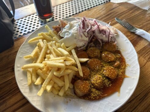 Pommes mit Currywurst und Gyros.
