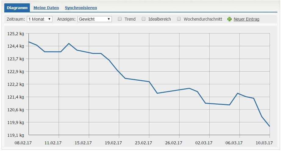 Das wären seit meinem letzten Blogpost – vor 1,5 Wochen – wieder 2 Kilo weniger.