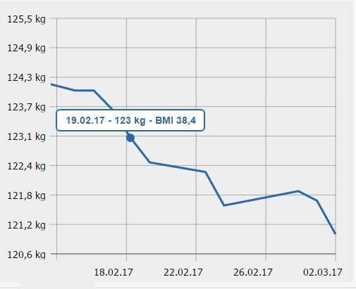 Und jedes Mal, wenn ich parallel dazu angefangen habe Sport zu betreiben, habe ich zwar die besten Ergebnisse in kürzester Zeit erzielt, aber wenn ich angekommen war, hörte ich auch mit dem Sport auf. Und schon ging es wieder nach oben.