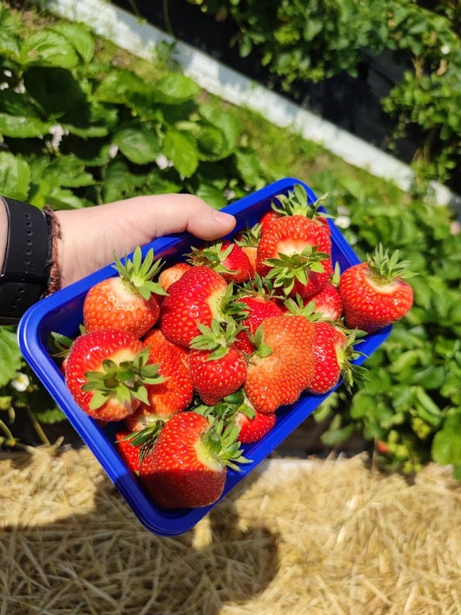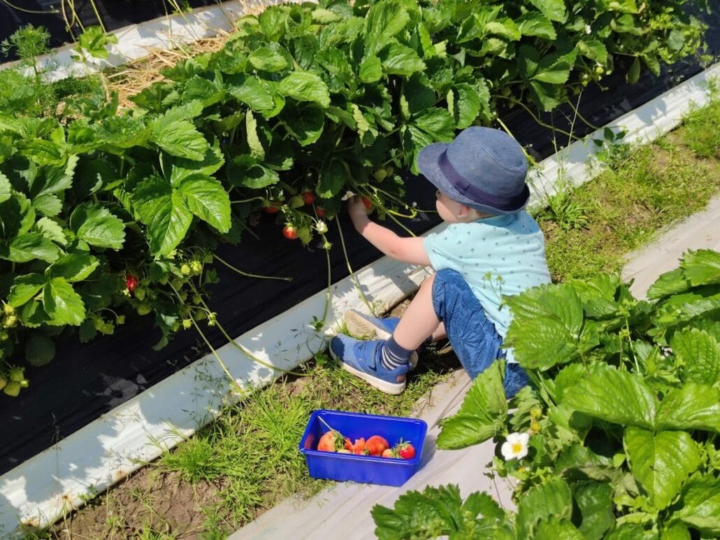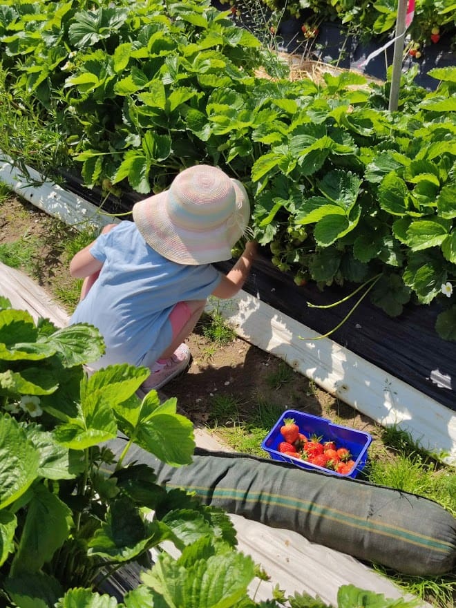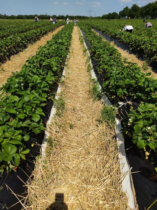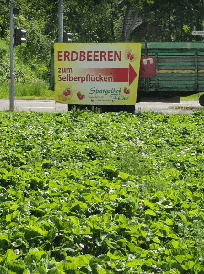 Je nach Wetter von Mai bis Juni kann man dort Erdbeeren selber pflücken.