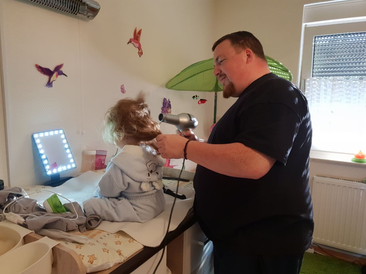Nach rund 10 Minuten und gefühlten 1000 Gramm Haarspray wartete ich mit der kleinen vor der Türe.