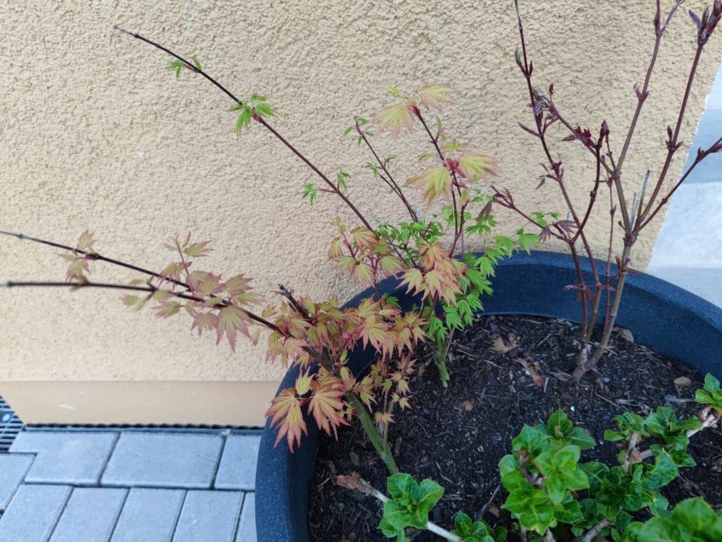 Auch war ich heute Morgen überrascht, dass die Ahornbäume vom letzten Jahr wieder anfangen zu blühen. Die haben den Winter da draußen überlebt.