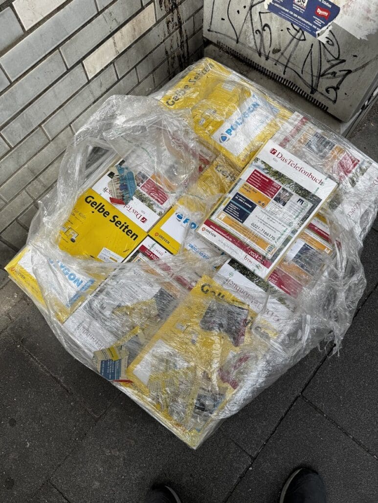 Ich dachte schon, „Das Telefonbuch“ und „Gelbe Seiten“ seien ausgestorben. Am Freitag habe ich sie dann neben einem Rewe auf der Palette gesehen.