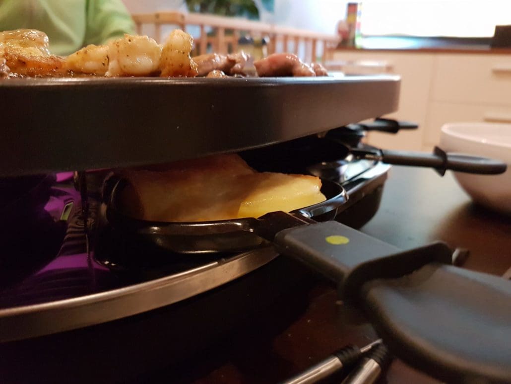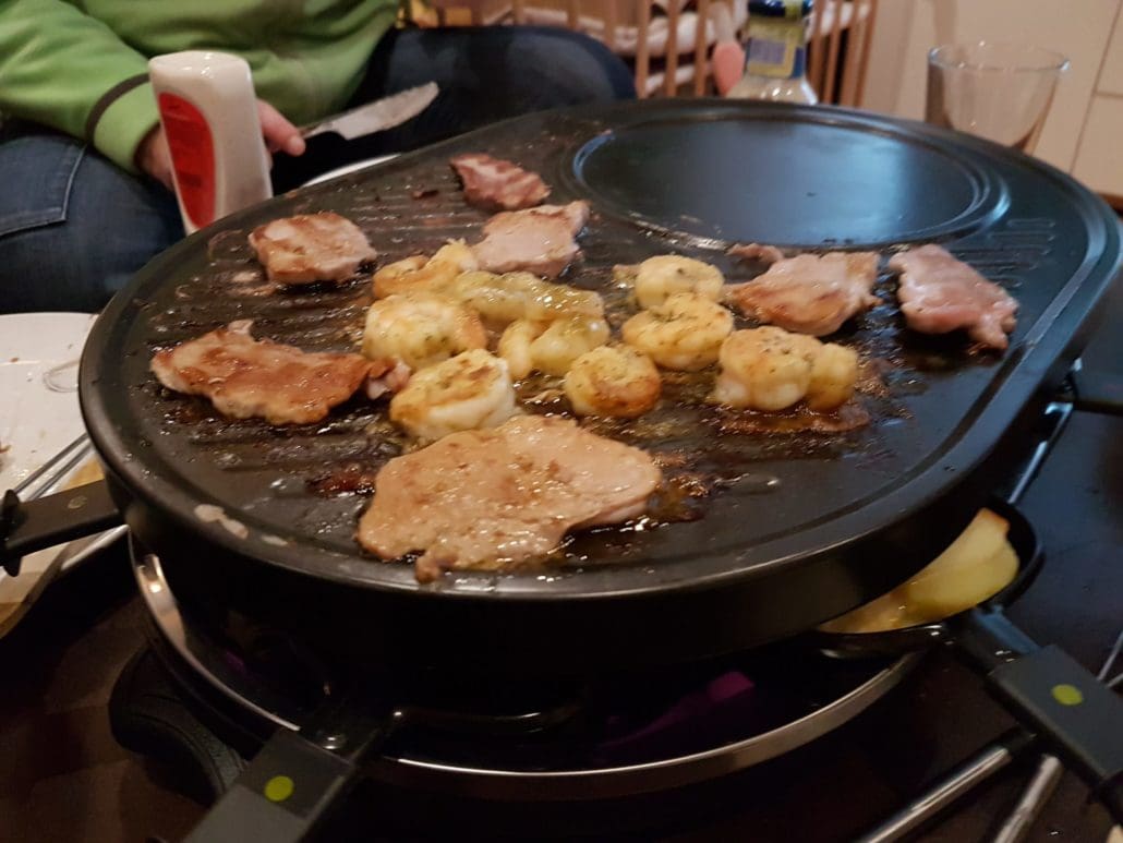 Es knallte plötzlich laut und das Fett flog uns um die Ohren. Vermutlich weil wir zwei Fettsorten verwendeten. Also landete am Ende alles auf dem Raclette.