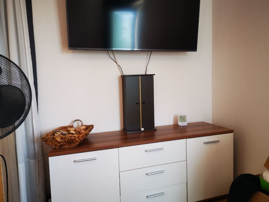 Den alten TV-Schrank haben wir dann im Schlafzimmer unter den Fernseher gepackt. Da passt es tatsächlich auch sehr gut hin und wir haben nun im Schlafzimmer einen Schrank für Gerümpel.