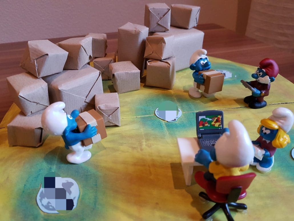 Papaschlumpf (Chef), Schlumpfine (Chefin mit Buchführung), unsere Lageristen und das Büro.