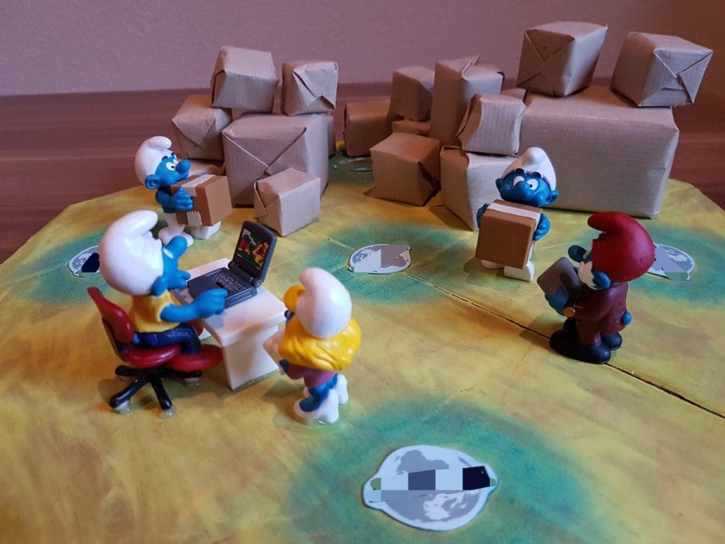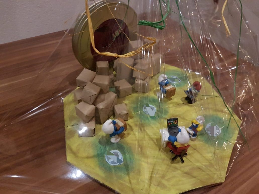 Dazu hat meine Frau unsere Firma als kleines Schlumpf Dorf gebastelt.