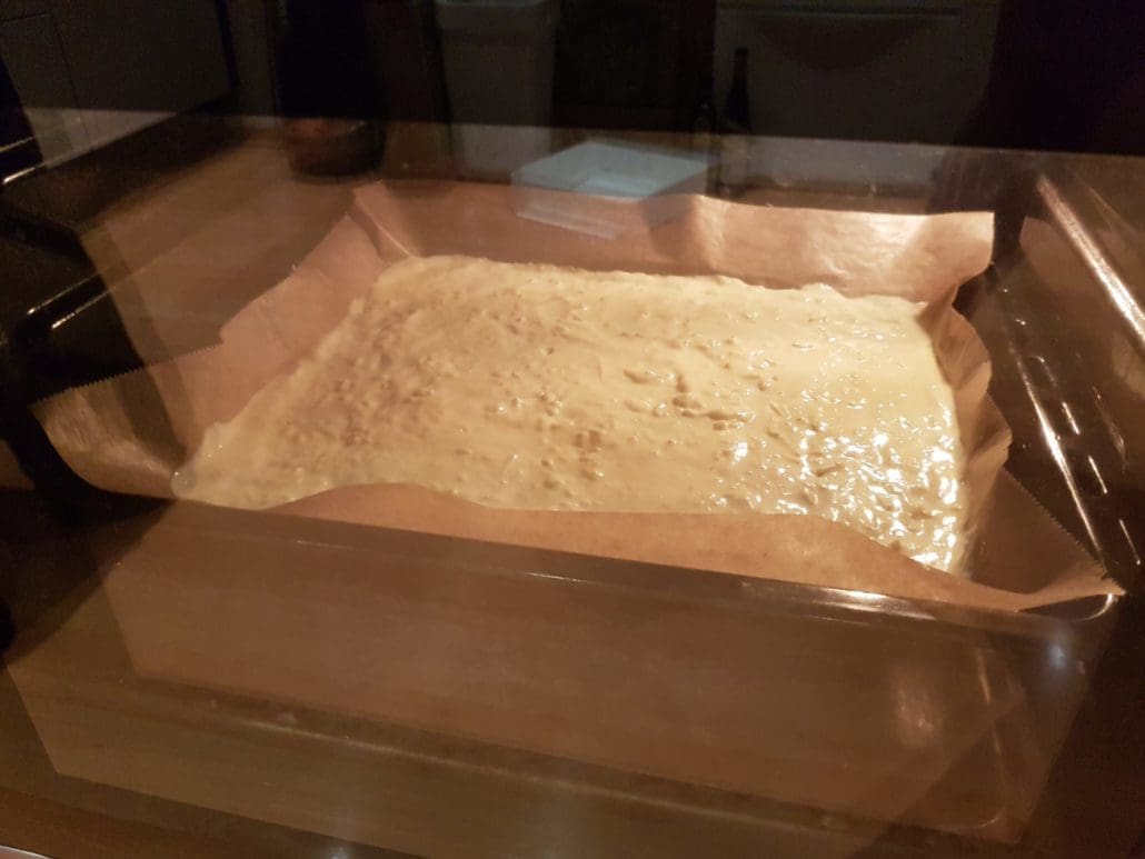 Wenn es flüssig ist, auf ein Backblech mit Backpapier verteilen. Ab in den Backofen bei 180 Grad so lange aufbacken bis es leicht braun ist. (5~10 Minuten).