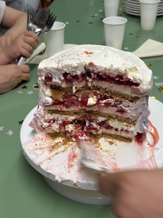 Statt Überstunden in der Küche zu verbringen, hat sie sich drei fertige kleine tiefgekühlte Torten gekauft, diese aufeinandergestapelt und mit Sahne fixiert.