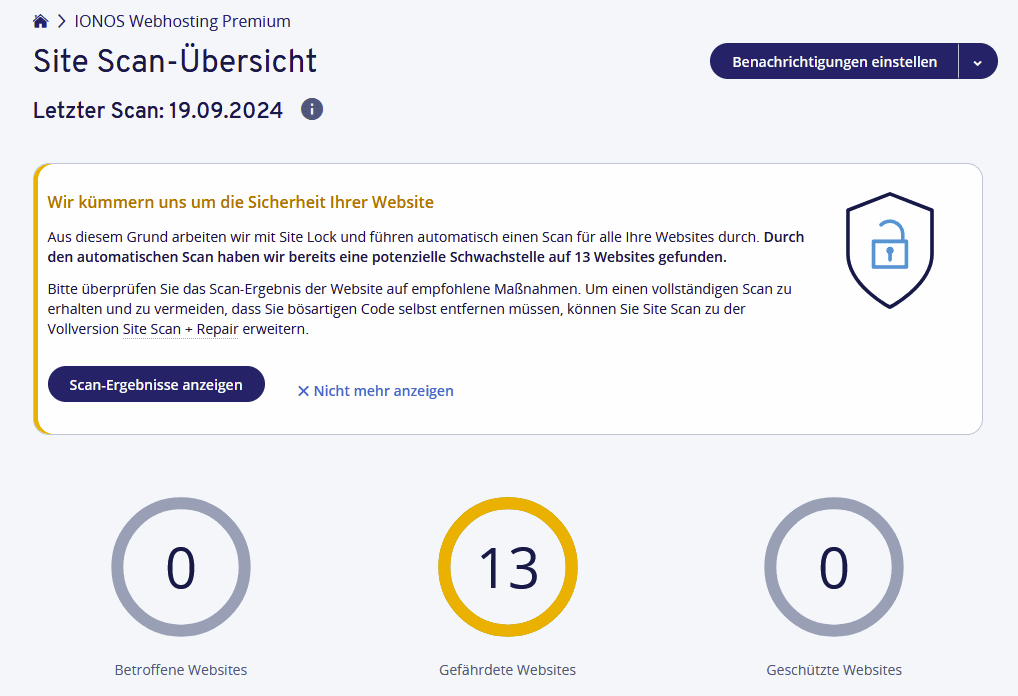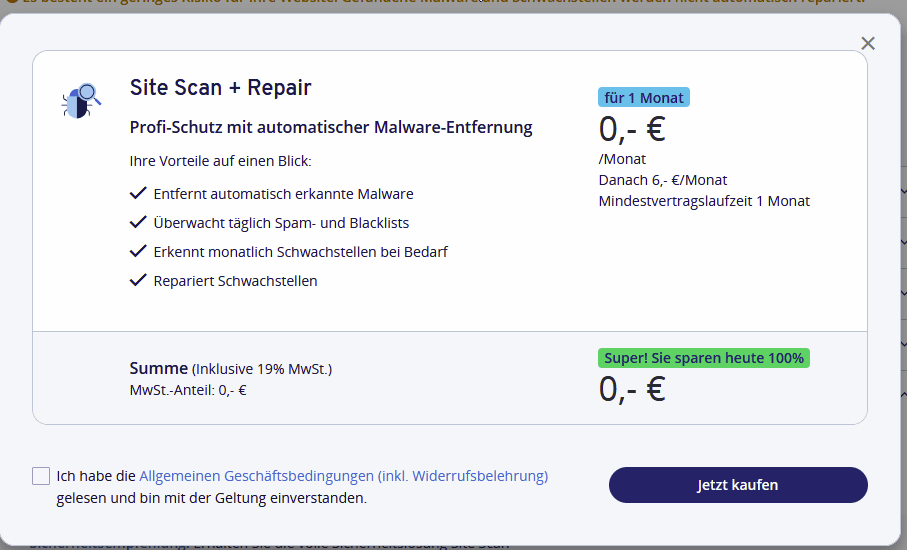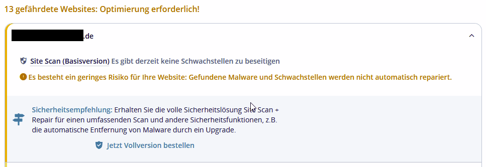 Sicherheitsempfehlung: Erhalten Sie die volle Sicherheitslösung Site Scan + Repair für einen umfassenden Scan und andere Sicherheitsfunktionen, z.B. die automatische Entfernung von Malware durch ein Upgrade.