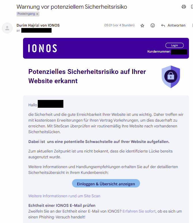 Ich bekomme eine E-Mail weitergeleitet – von jemandem – der seine Domains bei Ionos hat.
