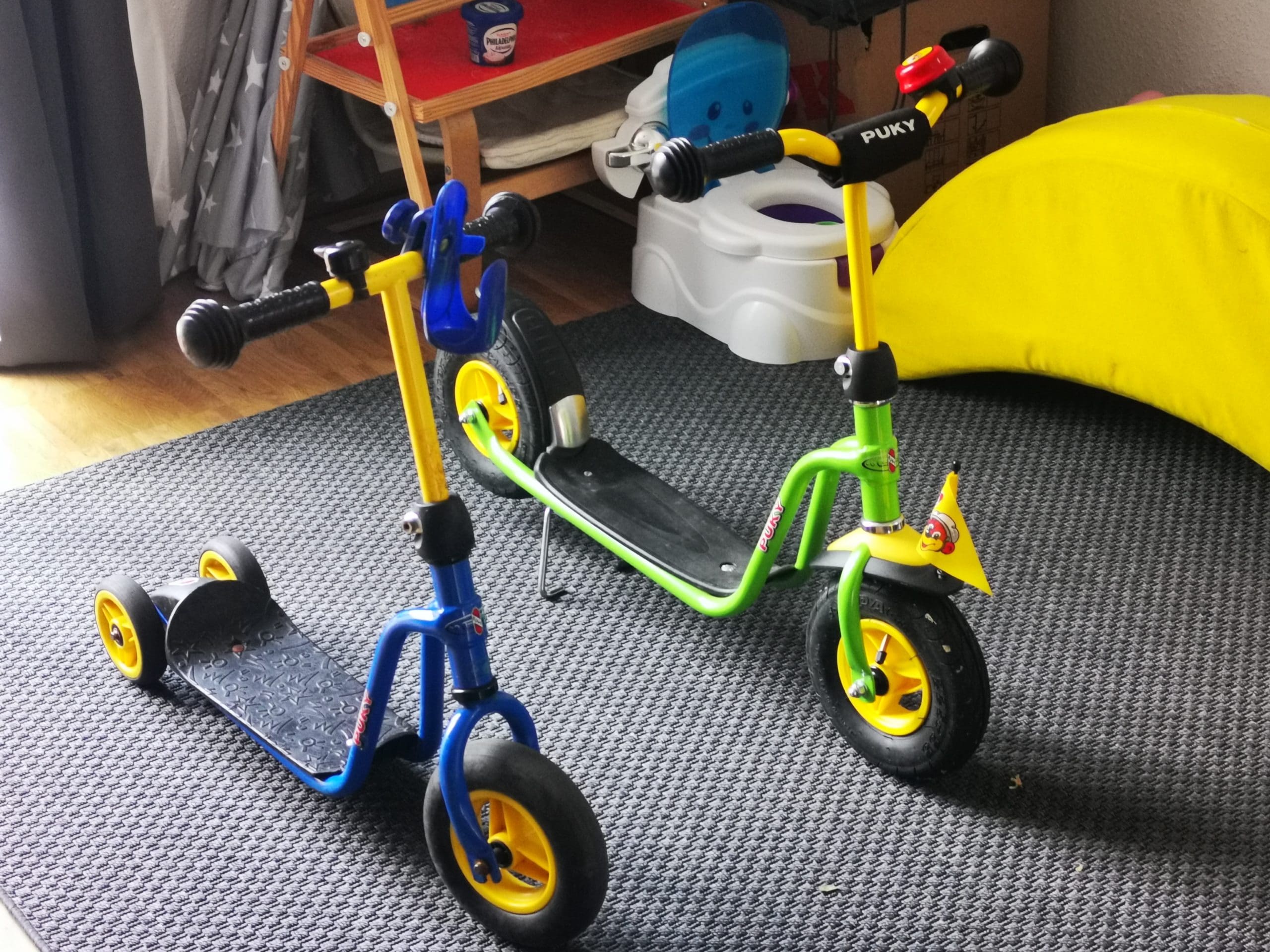 Da ihr Geburtstag noch fast ein Jahr dauert und Weihnachten etwas zu spät ist, hat meine Frau kurzerhand über ebay Kleinanzeigen für beide den passenden Tretroller sehr günstig ergattern können.