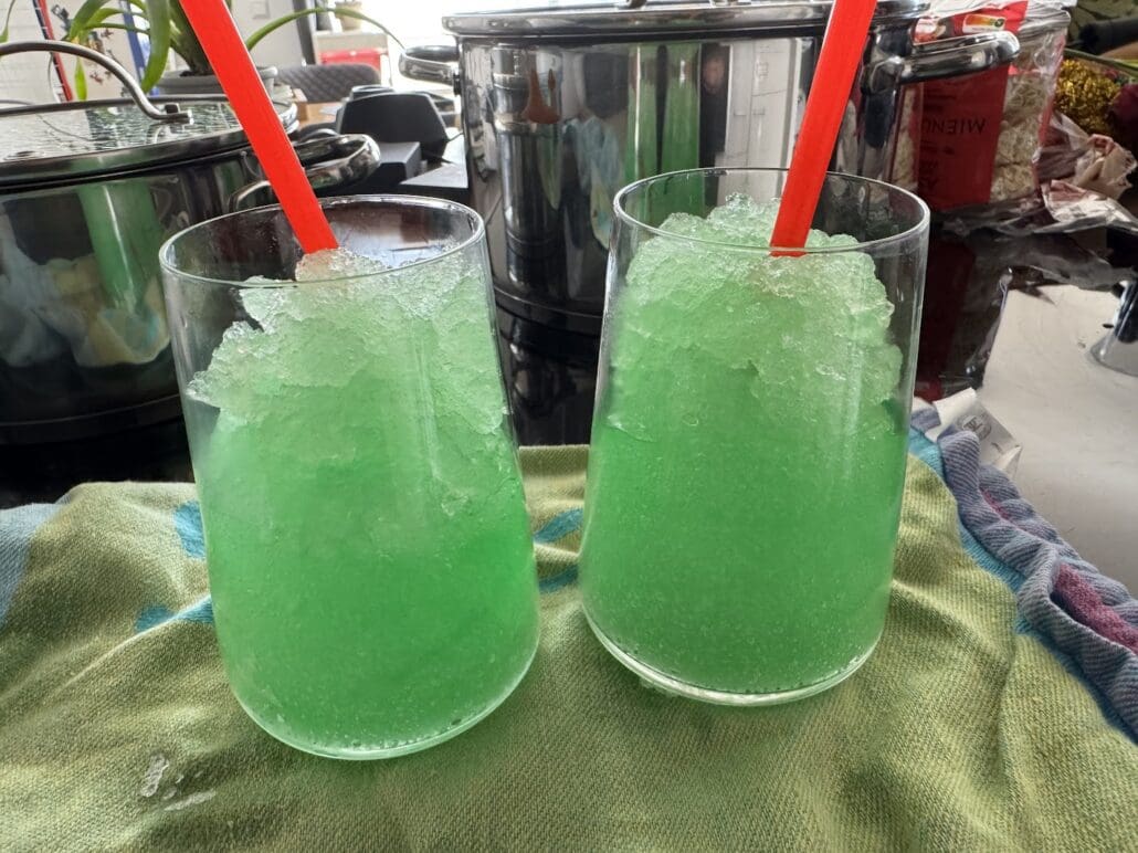 Ich wollte schon zum Büdchen dackeln, da fiel mir ein, das müsste doch auch meine Küchenmaschine können. Also auf zum Großhandel, 5 Kilo Eiswürfel, verschiedene Sirup Sorten und ab in den Mixer.