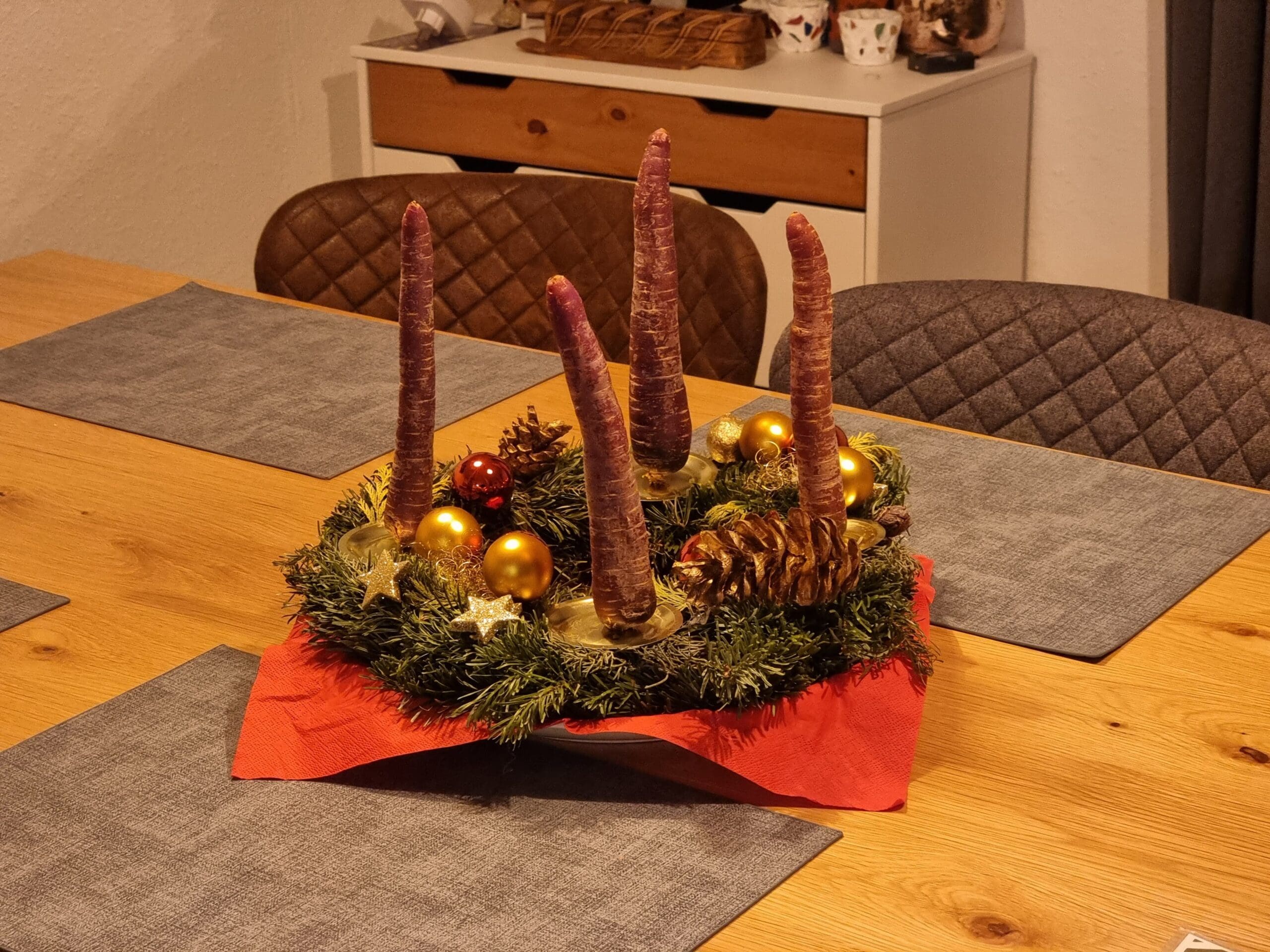 Später stellten die kleinen fest, dass er uns die Kerzen vom Adventskranz gegen Möhren getauscht hat …..